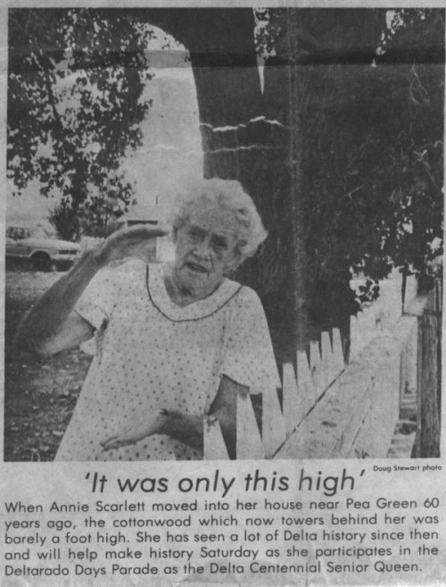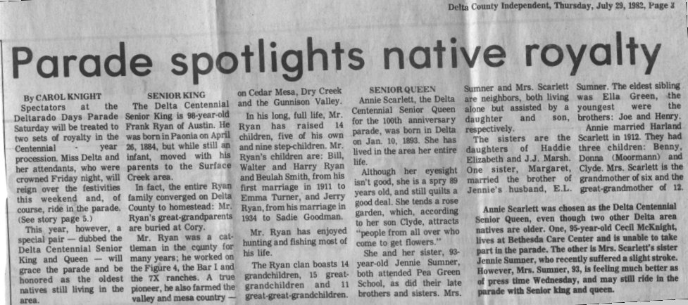 Delta County Independent, Thursday, July 29, 1982, Page 3 'It was only this high' When Annie Scarlett moved into her house near Pea Green 60 years ago, the cottonwood which now towers behind her was barely a foot high. She has seen a lot of Delta history since then and will help make history Saturday as she participates in the Deltarado Days Parade as the Delta Centennial Senior Queen. Parade spotlights Native royalty Spectators at the Deltarado Days Parade Saturday will be treated to two sets of royalty in the Centennial year procession. Miss Delta and her attendants, who were crowned Friday night, will reign over the festivities this weekend and, of course ride in the parade. (see story page 5). This year, however, a special pair - dubbed the Delta Centennial Senior King and Queen - will grace the parade and be honored as the oldest natives still living in the area. SENIOR KING he Delta Centennial Senior King is 98-year old Frank Ryan of Austin. He was born in Paonia on April 26, 1884, but while still an infant, moved with his parents to the Surface Creek area. In fact, the entire Ryan family converged on Delta County to homestead: Mr. Ryan's great-grandparents are buried at Cory. Mr. Ryan was a cattleman in the county for many years; he worked on the Figure 4, the Bar I and 7X ranches. A true pioneer, he also farmed the valley and mesa country -on Cedar Mesa, Dry Creek and the Gunnison Valley. In his long, full life, Mr. Ryan has raised 14 children, five of his own, and nine step-children. Mr. Ryan's children are: Bill, Walter and Harry Ryan and Beulah Smith, from his first marriage in 1911 to Emma Turner, and Jerry Ryan, from his marriage in 1934 to Sadie Goodman. Mr. Ryan has enjoyed hunting and fishing most of his life. The Ryan clan boasts 14 grandchildren, 15 great-grandchildren and 11 great-great-grandchildren. SENIOR QUEEN Annie Scarlett, the Delta Centennial Senior Queen for the 100th anniversary parade, was born in Delta on Jan 10, 1893. She has lived in the area her entire life. Although her eyesight isn't good, she is a spry 89 years old, and still quilts a good deal. She tends a rose garden, which, according to her son Clyde, attracts "people from all over who come to get flowers." She and her sister, 93-year-old Jennie Sumner, both attended Pea Green School, as did their late brothers and sisters. Mrs. Sumner and Mrs. Scarlett are neighbors, both living alone but assisted by a daughter and a son, respectively. The sisters are the daughters of Haddie [Hattie] Elizabeth and J.J. Marsh. One sister, Margaret, married the brother of Jennie's husband, E.L. Sumner. The eldest sibling was Ella Green, the youngest were the brothers: Joe and Henry. Annie married Harland Scarlett in 1912. They had three children: Benny, Donna (Moormann) and Clyde. Mrs. Scarlett is the grandmother of six and the great-grandmother of 12. Annie Scarlett was chosen as the Delta Centennial Senior Queen, even though two other Delta area natives are older. One, 95-year-old Cecil McKnight, lives at Bethesda care Center and is unable to take part in the parade. The other is Mrs. Scarlett's sister Jennie Sumner, who recently suffered a slight stroke. However, Mrs. Sumner, 93, is feeling much better as of press time Wednesday, and may still ride in the parade with Senior king and queen. transcribed by Betty Baker, March 2002. |
