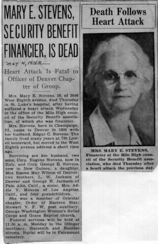 Mrs. Mary E. Stevens, 58, of 3646 West Eighth avenue, died Thursday [May 4] in St. Luke's hospital, after having suffered a heart attack Wednesday in the office of the Mile High council of the Security Benefit association, of which she was a financier.