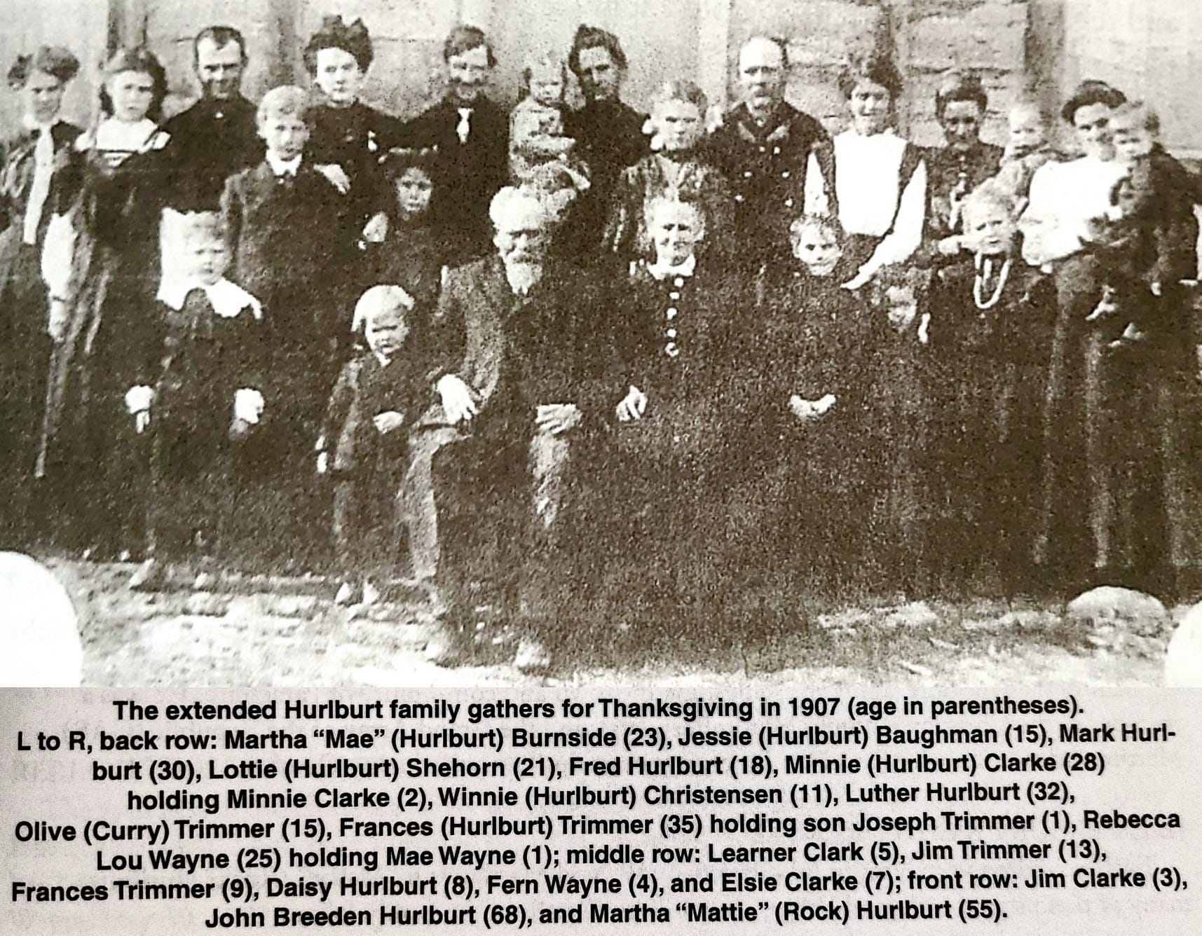 Back row: Winifred Silvery Hurlburt Christensen, My grandma Minnie Hester Hurlburt Clarke, cousin Lizzie Burnside (I think), Jesse Evelyn(?) Hurlburt Middle row: Alli Hurlburt- wife of Fred Fisher Hurlburt , Daisy June Hurlburt Green, Martha “ Mae” Hurlburt Burnside. Front: My Great Grandparents Martha Ann Rock and John Breeden Hurlburt.