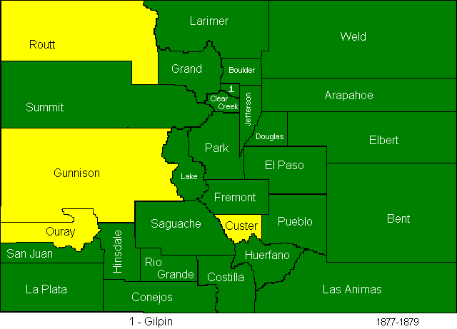 In 1874, Greenwood and Platte Counties were abolished, Bent, La Plata, Hinsdale, Rio Grande, Elbert, and Grand Counties were created. (Bent County is often reported to have been created in 1870, but this page creator believes that those reports are using the date of the creation of the now defunct Greenwood County as the date of the creation of the successor county.)