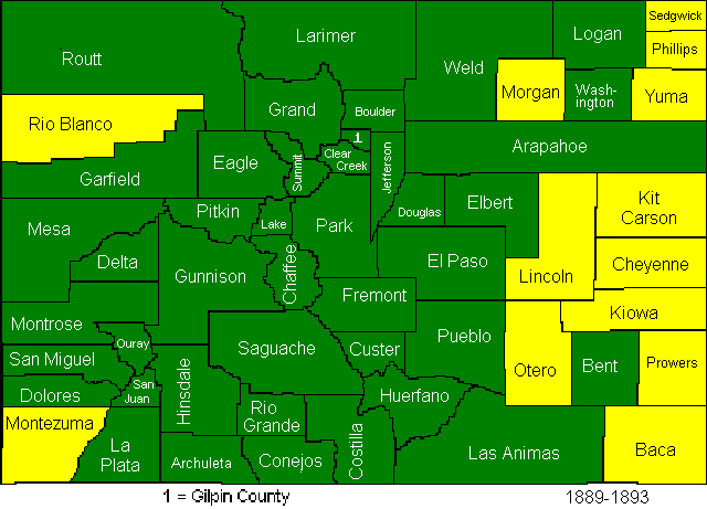 In 1889 the legislature was very busy. The following counties were created: Montezuma, Rio Blanco, Morgan, Sedgwick, Phillips, Yuma, Lincoln, Kit Carson, Cheyenne, Kiowa, Prowers, Otero, and Baca.