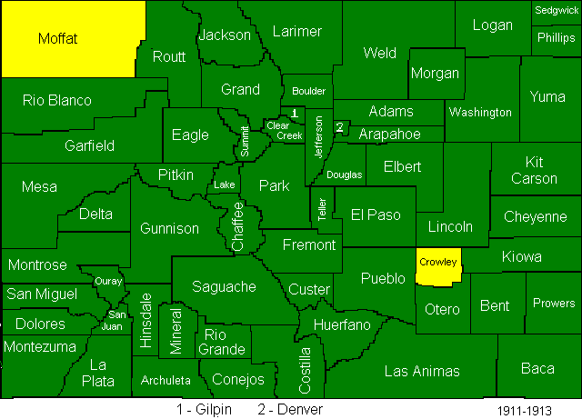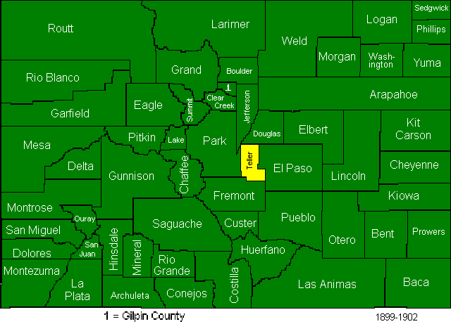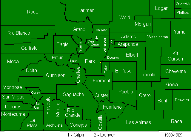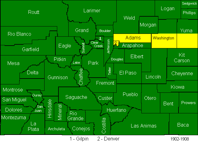 The Arapahoe county split created Denver and Adams Counties, and sent parts of what had been Arapahoe County to Washington and Yuma Counties. Due to some legal wrangling some of the final results of this act were not officially in place until 1906.