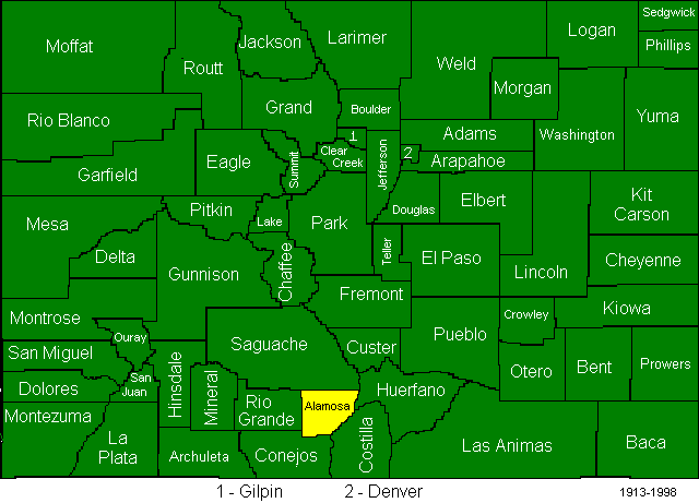 Colorado Territory was established by Congress on February 28, 1861. The first Legislative Assembly of the Territory of Colorado convened on September 9, 1861. They quickly enacted laws establishing the seventeen original counties. At that time Conejos County was called Guadalupe County, but within a couple years had become known by its current name.