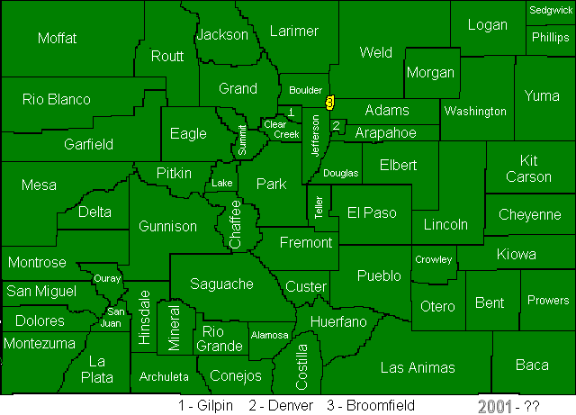A proposal on the November, 1998 ballot to make the town of Broomfield into the city and county of Broomfield was voted on by the people of Colorado - it passed. This created, effective 2001, a small county (much smaller than Denver) that covers the corners of what were Jefferson, Boulder, Weld, and Adams Counties. The map now looks like: