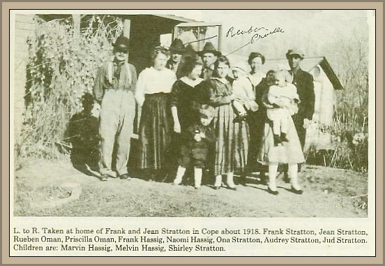 Nels and Josie and son Reuben moved around 1916 to Cope, where their son Olaf had homesteaded. They bought a farm about five miles northwest of Cope. Their daughter Lillie and her husband Charles Swanson, also moved from Lyons, Nebraska (after 1916, because the 1930 census said Lois was born in Nebraska). Nels/Josie's son Reuben also homesteaded near Cope. Later Nels' half -brother Eric Rodin (who married Hulda's sister Annie) also lived near Cope for a time. Reuben married Priscilla Stratton December 21, 1916. - From the History of Cope