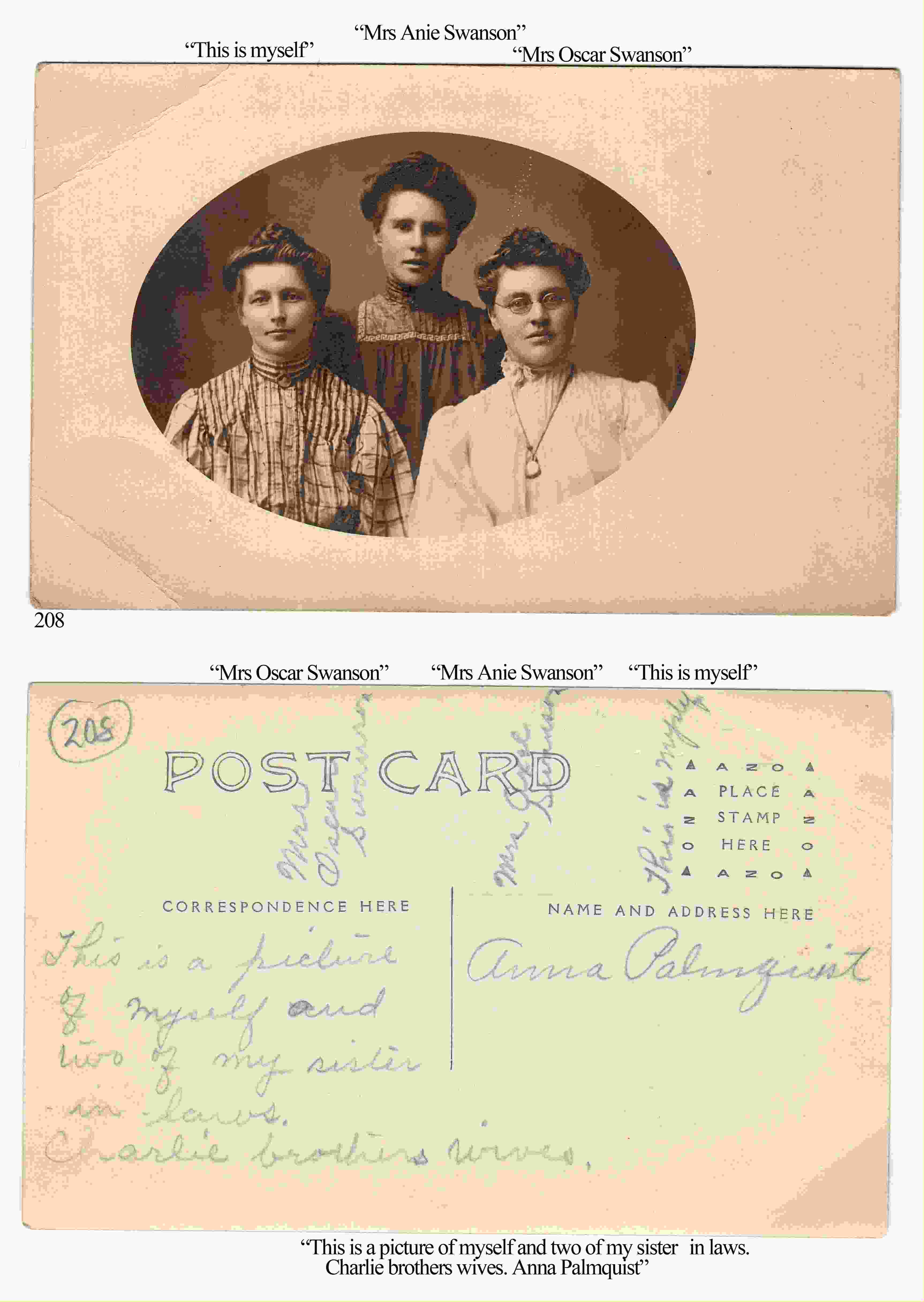 This above photo is Lillie OMAN Swanson and her sisters in law, sent to her aunt in Sweden. Mrs Anie Swanson is Anna A. Tureen, b. 1887 Nebraska, d Apr 1968, married to Victor Emanuel Swanson, b Dec 27, 1886, d Apr 4, 1946. Mrs. Oscar Swanson would be Hilma Sophia Kristina, b Sept 5, 1885, d Dec 5, 1968 who was married to Oscar Edward Swanson, b Apr 9, 1885, d Oct 11, 1929.