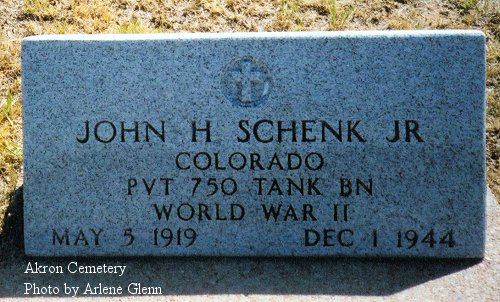 John Harry Schenk Jr., son of Mr. and Mrs. John Schenk Sr., was born May 5, 1919 at Akron, Colorado, and was killed on December 1, 1944. while in action against the enemy in Germany at the age of 25 years, 6 months and 26 days.