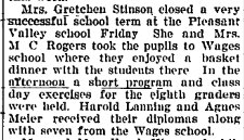 April 26, 1934 "Miss Edith New closed a very successful term of school at Pleasant Valley last Friday with a picnic dinner and weiner roast."