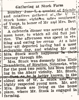 1941 "Miss Olga Hollars, of Greeley, teaches at the Pleasant Hill school and Mrs. Stuck, of Yuma, teaches at Pleasant Valley."