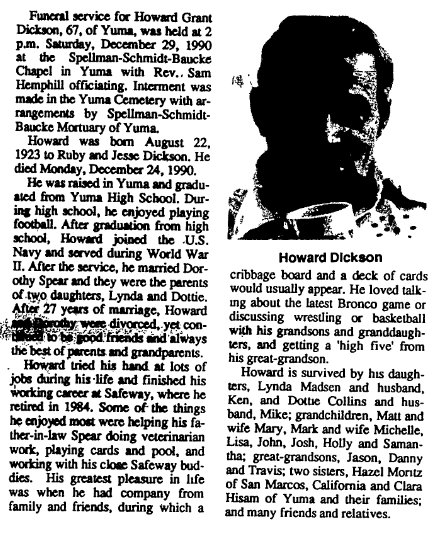 The following story was given to me by Ben Dickson. Jess Dickson, who told the story was Ben's uncle and the father of Clara Hisam [Mrs. Eugene Hisam]. Jess, born in July of 1881, was the oldest of five children. His father, Matthew Dickson, was born and grew up in New Jersey. Matthew's father, a Union Soldier, was killed in the Civil War, so Matt, his brother and two sisters were raised by their mother. Matt met and fell in love with a young lady by the name of Indiana Harmon. Indiana's father, a Confederate soldier, was also killed in the Civil War. Matt and Indiana were married in Switzerland County, Indiana and later moved to Illinois where two of their children, Jess and Myrtle, were born. Matt came to eastern Colorado on Christmas Eve 1886 and filed a pre-emption claim on land seven miles northeast of Yuma. [This was about half-way to the land where Ruby's older brother Francis (Frank) Woodward and older sister Cynthia Ann Woodward filed] Three more children, Maude, Lester, and Benjamin, were born in Colorado. According to a granddaughter, Indiana's family did not want her to move to Colorado. They thought it was nothing but a wilderness with Indians. When she came here anyway they never wrote to her or contacted her again. As a young man, Jess worked as a cowboy and ranch hand. After his marriage to Ruby Woodward he ran a dray business. That meant he met the train with his team and wagon and hauled the sample cases, etc. of the drummers (salesmen) to the various stores so they could show their wares. He also unloaded flour, sugar and other groceries that arrived on the train and hauled them to the stores or where ever they needed to go. When trucks were invented and came into the area, he quit the dray business and worked at the Red and White store and later for Mustains. [both were grocery stores - Mustain's still in business in Yuma] Jess was one of the first firemen and was a charter member of the Yuma Volunteer Fire Department. He and Ruby were the parents of four children, Dexter, (who died as an infant), Howard, Hazel and Clara. [in the 1950's Jess and Ruby worked at a creamery on Railroad Street just east of Main. They lived on North Main, on the east side directly across from the fairground road]