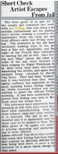 June 1935 "A. C. Doling, formerly of McCook, Neb., is serving a six months jail sentence in the county jail at Wray for writing short checks here. He was arrested in Fort Morgan last Wednesday and was brought here by Sheriff Raymond Van Horn. He was arraigned before Justice J. F. Garton Friday yTid was given the jail sentence and a fine of $25. He was charged with passing three checks for $5 each at both the Rexall Drug Store and the J. C. Penney Company store in Wray."