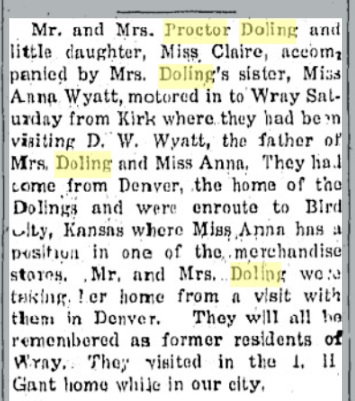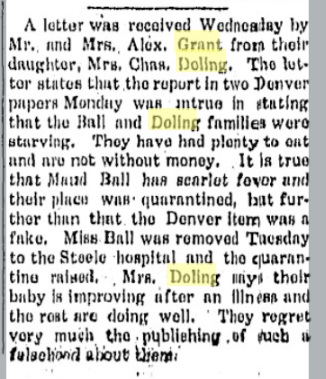 November 1935 Wray "Glenn Doling of McCook died last Friday in Greeley, Colo., following an illness of several months. Funeral services were held at McCook Tuesday and the remains were buried in the McCook cemetery. Surviving him are his wife, one son, one daughter, his father Chas. Doling of Brush, one brother Arthur also of Brush, as well as many less near relatives including his uncle T. G. Grant and his aunt, Mrs. Marion Pickett both of Wray, another uncle John Doling of Idalia, The parents of the deceased man resided in Wray for a number of years. Glenn Doling was a baker by trade and had been employed at the Fallick bakery in McCook for eighteen years."