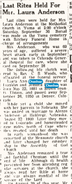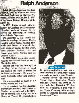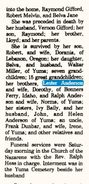 "Survived by her husband, John Bailey of Yuma, brothers Lester of Bonners Ferry, Idaho, and Ralph Anderson of Yuma, niece Belva Miller of Yuma, uncle Frank Dunbar of Yuma, and many nieces and nephews.
