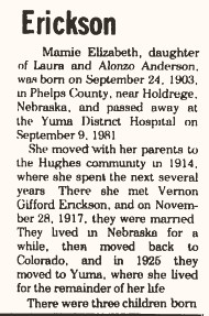three sisters, Mrs. Mamie Erickson, Mrs. Iva Bailey and Helen Anderson, all of Yuma."