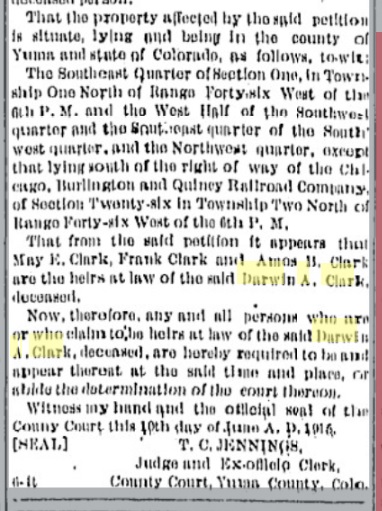 January 1908 Yuma "Harry Barnes of Eckley was in this neighborhood Tuesday."