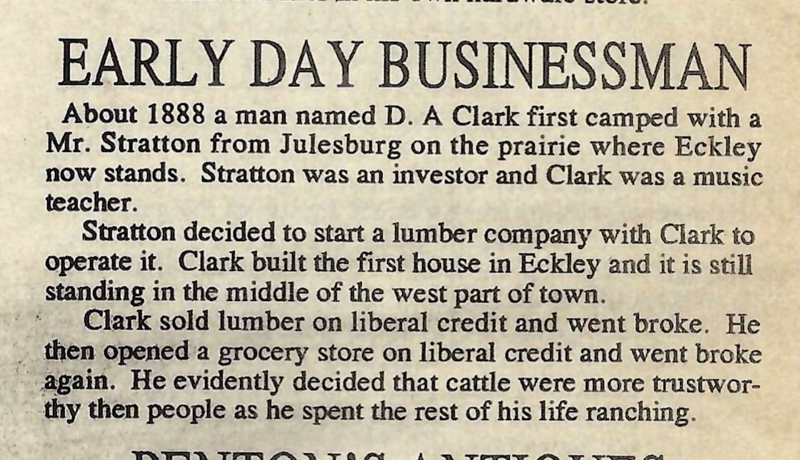 One of the speakers was Amos Clark of Denver who, with his wife, made an exhibit at the Library of old newspapers and pictures of Eckiey at its beginning. Mr. Clark's father, D. A. Clark, owned this land and his ranch buildings stood where Eckiey is now. He operated the first store here in 1890.