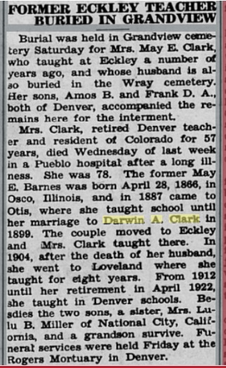 August 1945 Wray "Mr. and Mrs. Frank D. A. Clark of Denver visited Wednesday for several hours at the home of Mr. and Mrs. A. E. Miller in Wray."