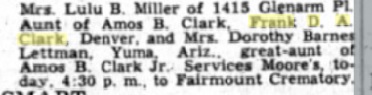 April 1923 Montrose, Colorado "Mrs. Frank D. A. Clark arrived on Wednesday from Denver to be with her husband, who travels tor the Moore Hardware and Iron Co., and who was taken ill here on Sunday night Mr. Clark Is getting along very nicely."