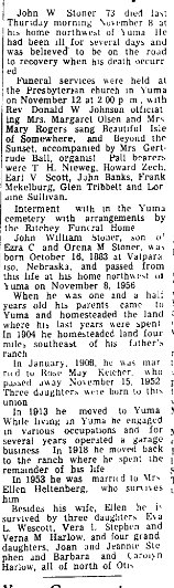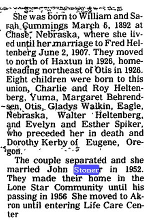 Eva Irene Westcott, daughter of John F. Stoner and Rose Kietcher, born at Yuma Colorado Dec 18, 1908, died February 3, 1965 at Weslaco, Texas.