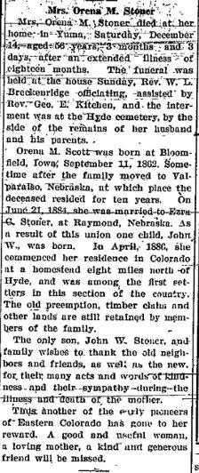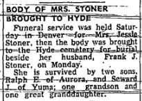 Yuma Colorado January 2, 1903 "Mrs. C.E. Bruner, who has been visiting at the home of her aunt, Mrs. F. J. Stoner, returned to her home in York, Nebraska."