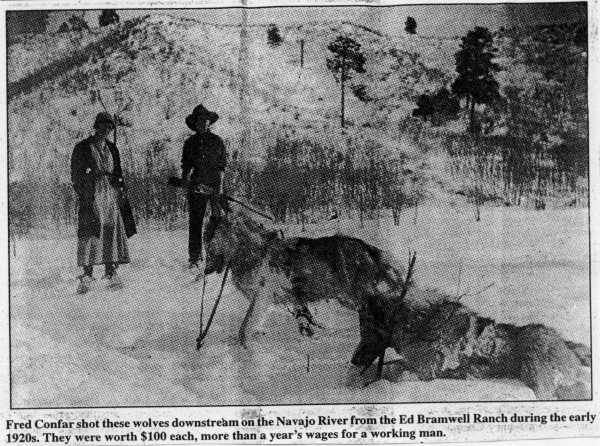 Fred Confar shot these wolves downstream from the Navajo River from the Ed Bramwell Ranch during the early 1920s. They were worth $100 each, more than a year's wages for a working man.