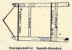 | Every small farmer cannot afford the expense of buying a land-grader. Laboring under this inconvenience. Gordon Grimes of Pagosa Springs, Colo., built one which is simple and easily made, and has the desired effect—that is, it levels the land by scraping the dirt off the high places and depositing it in the low places automatically. It will level up a back-furrow as completely as if it had never existed. To make this machine, take two pieces, 2x4 and 20 feet long, place them 7 feet apart, like sled runners, with the front ends sloping upward. Then take a 2x6 7 feet long, and nail it crosswise between the front ends of the runners. Then take a plank 2x12 and fit it in the same manner as the front one, only putting it back about eight feet from the front scraper. Nail some pieces across on the top of the runners for braces, and it is ready for use, as