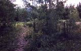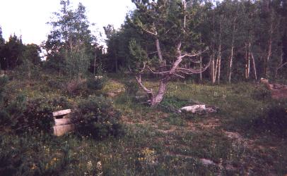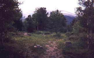 Passing through a forgotten ghost town, climbing on foot about 1/2 mile up and on the left, facing the Arapahoe Mountain and Baldy Mountain, you reach the fenced cemetery, the tombstones are missing; a few graves can be located by broken stones and fences, but the identities remain a mystery. The aspen trees quake in the wind as though to whisper the secrets of the glories days of Caribou. |