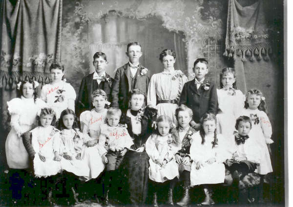 ca. 1908 Grade School Photo. Possibly official school photo. The five children of Alfred James and Mary Jemina (nee DAVIDSON) SMITH are identified. (1) Ida (back row second from left); (2) Neva (back row far right, standing); (3) Susie (front row, far left with bow in her hair); (4) Lucy (front row, third from left); with brother (5) Alfred leaning against her.