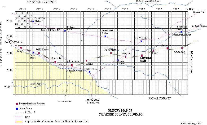 The map below is provided to give you a visual reference for the approximate location of Cheyenne County towns, trails, stage stations, railroads, etc. I have tried to put everything in the correct locations - as closely as possible. No claims for precision are being made.