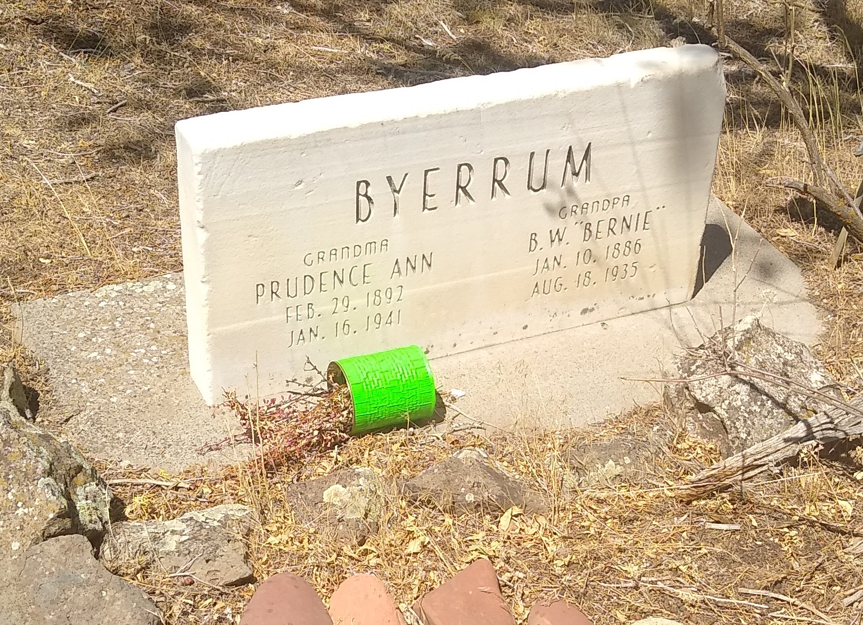 "Grandma" Prudence Ann Byerrum Feb 29 1892 - Jan 16 1941 "Grandpa" B. W. "Bernie" Byerrum Jan 10 1886 - Aug 18 1935