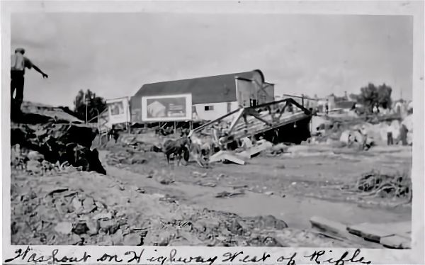The August 8, 1930 flood on Rifle Creek. 2nd version of City Stables in the background