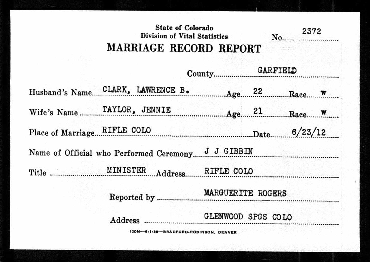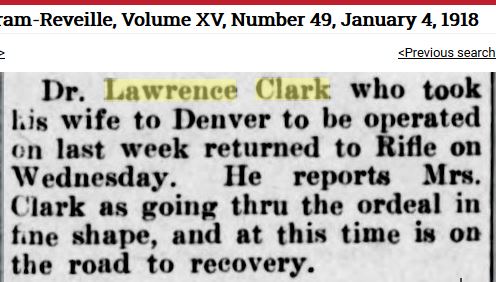 Lawrence married Jennie Lou Taylor in Rifle on June 23, 1912. Jennie was born