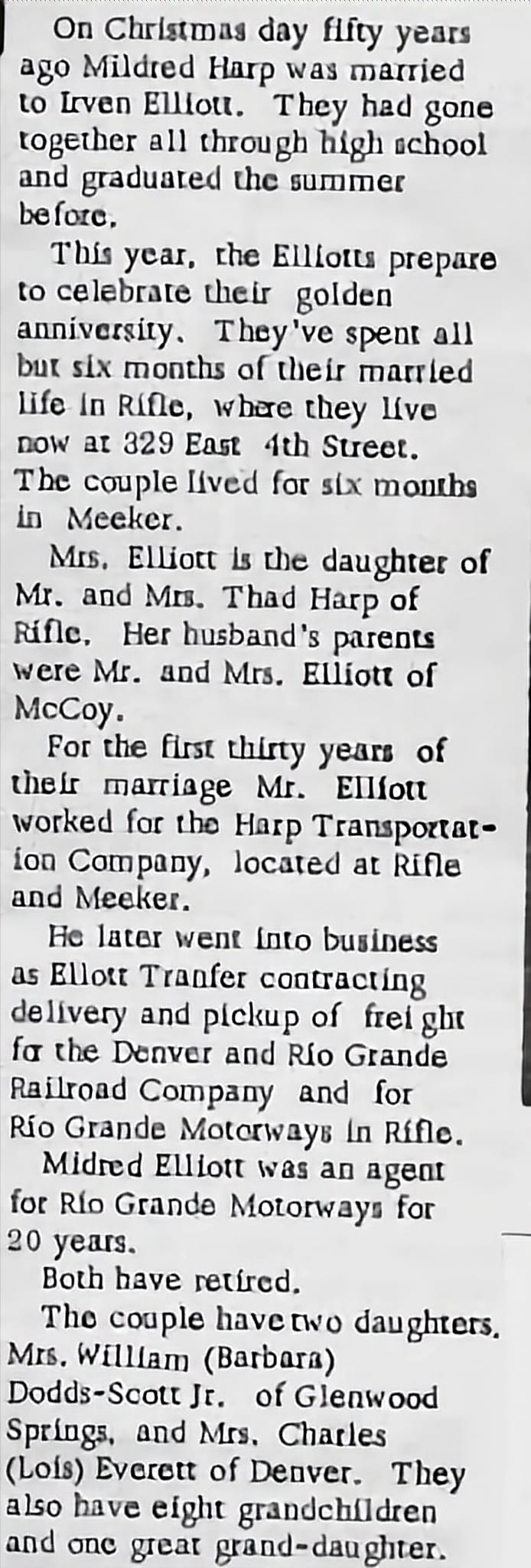 Harp was the daughter of Thad and Nettie Harp of Rifle.