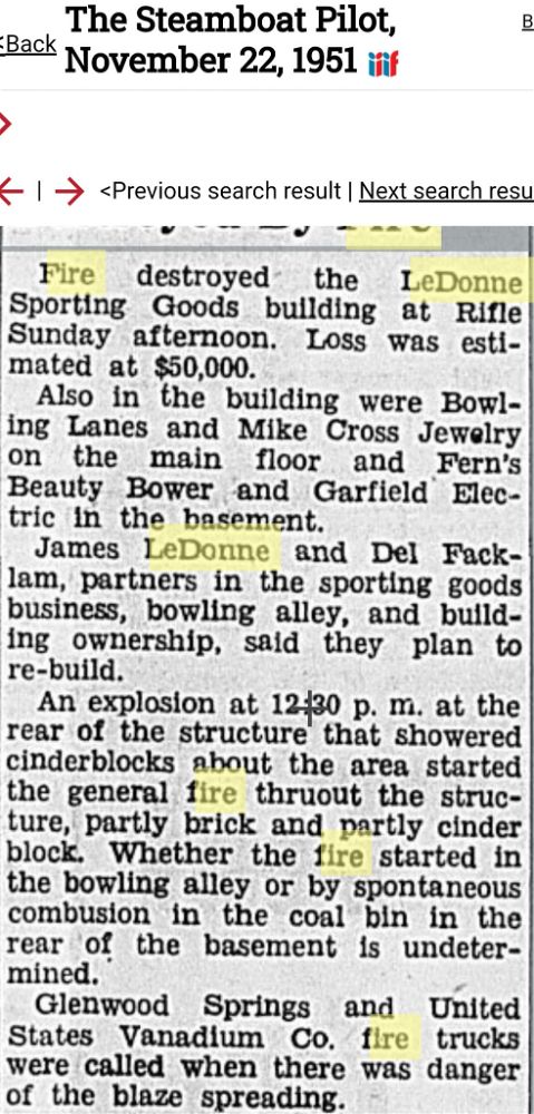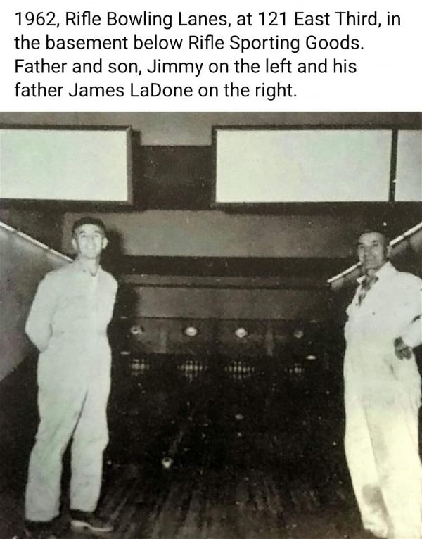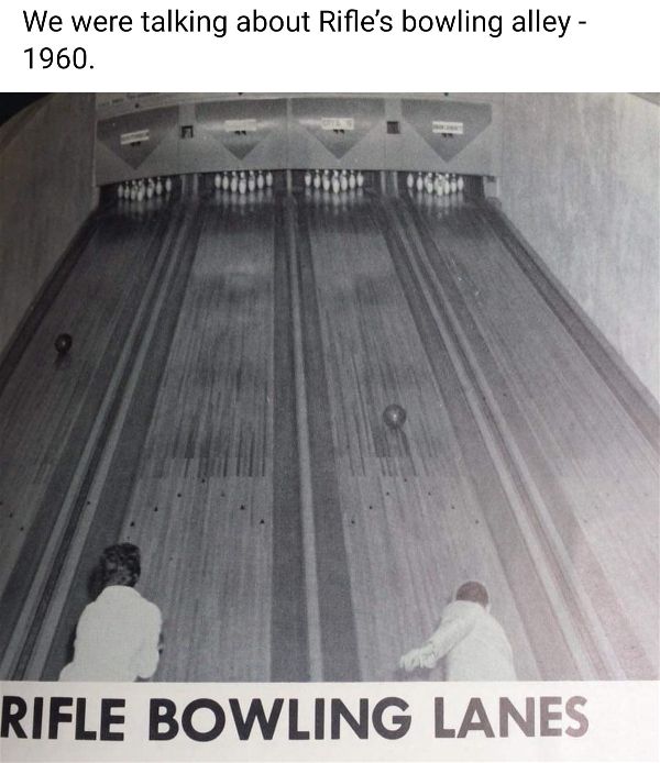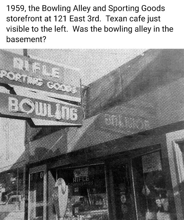bowling alley building had burned, the stores there were: Bowling Lanes
