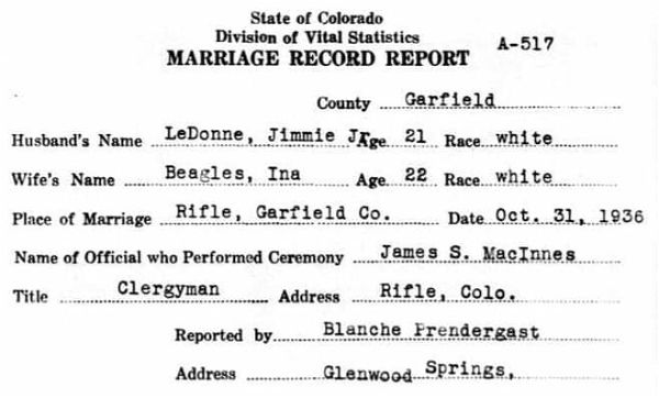 younger James married Ina Kathleen Beagles in Rifle on October 31, 1936.