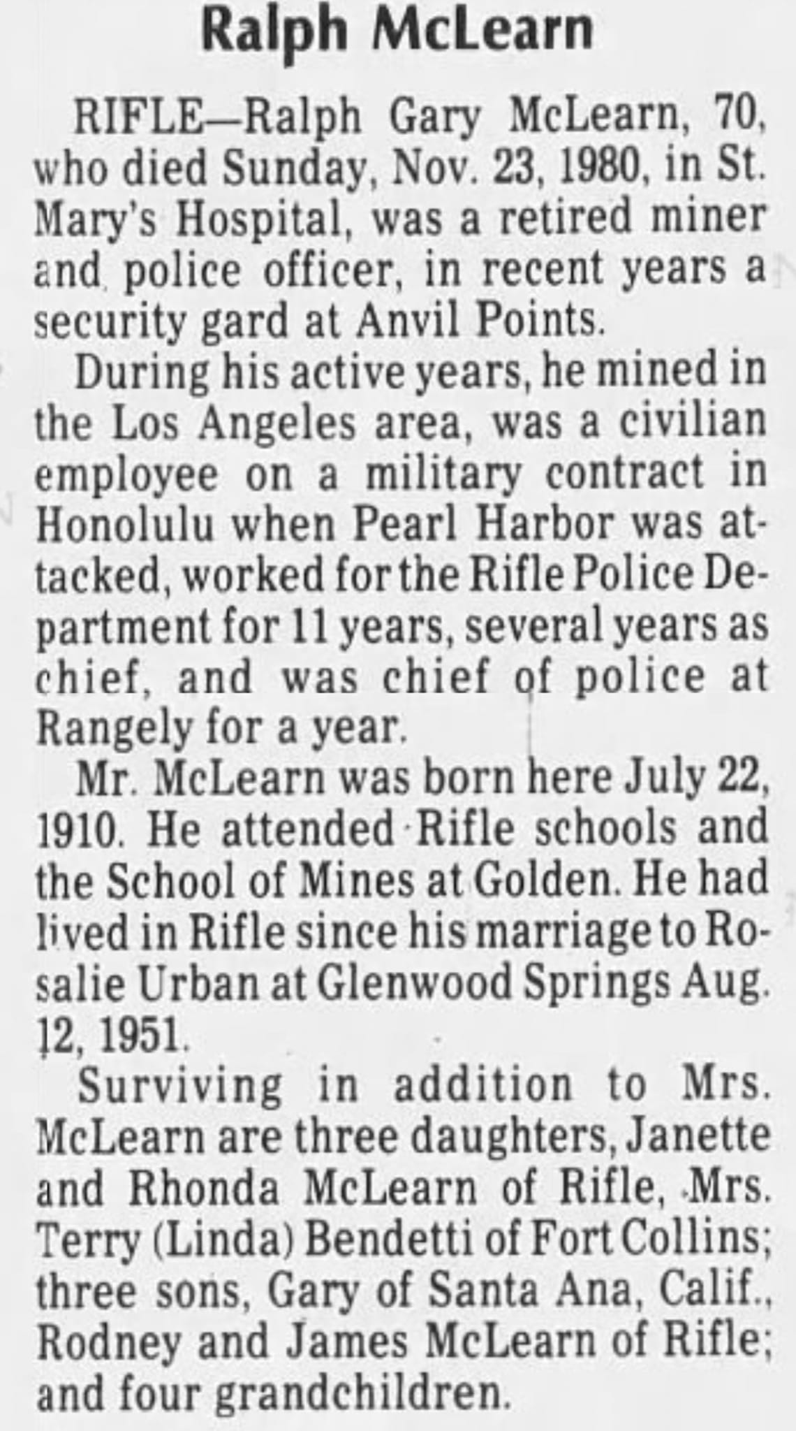 August 12, 1951, he married Rosalie Urban in Glenwood Springs. She had