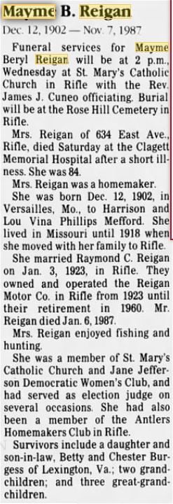 Mayme Beryl Mefford in Rifle in a Catholic ceremony. Mayme