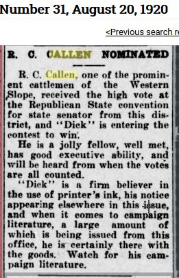 Eagle counties. That election was September 14, 1920, which he won. He served