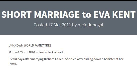 Kent October 7, 1890 in Leadville. But in a tragic accident she died 8 days