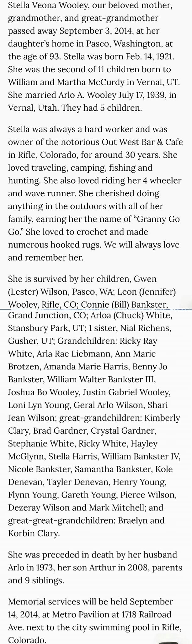directories show Stella living in Rifle as late as 2002.