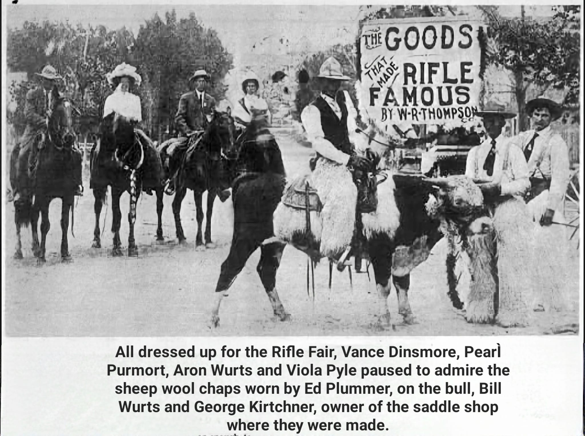 All dressed up for the Rifle Fair, Vance Dinsmore, Pearl Purmort, Aron Wurts and Viola Pyle pause to admire the sheep wool chaps worn by Ed Plummer, on the bull, Bill Wurts and George Kirtchner, owner of the saddle shop where they were made.