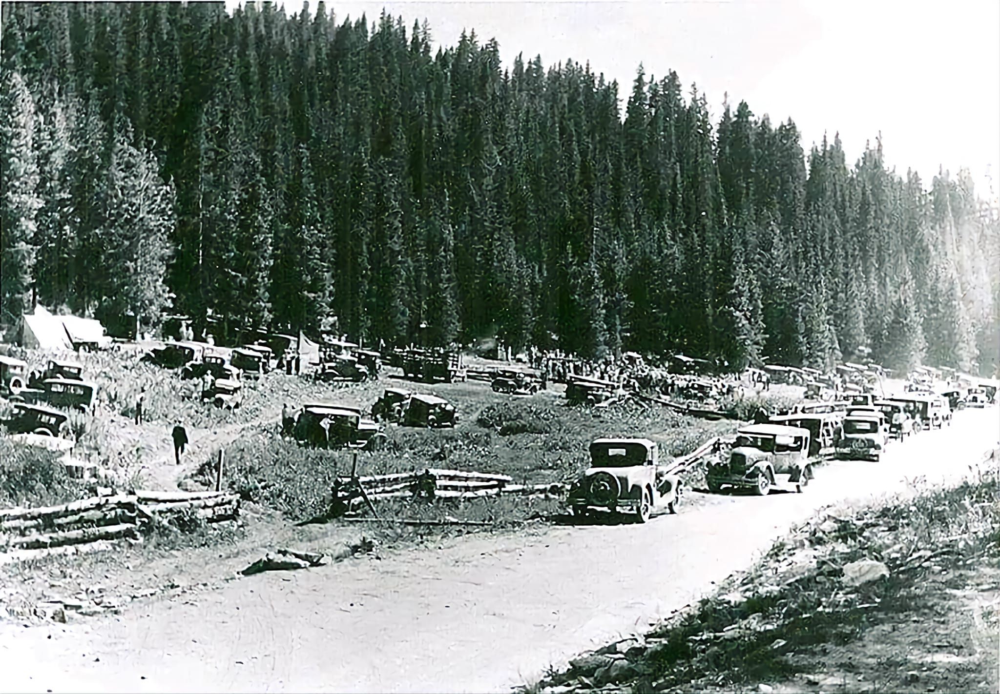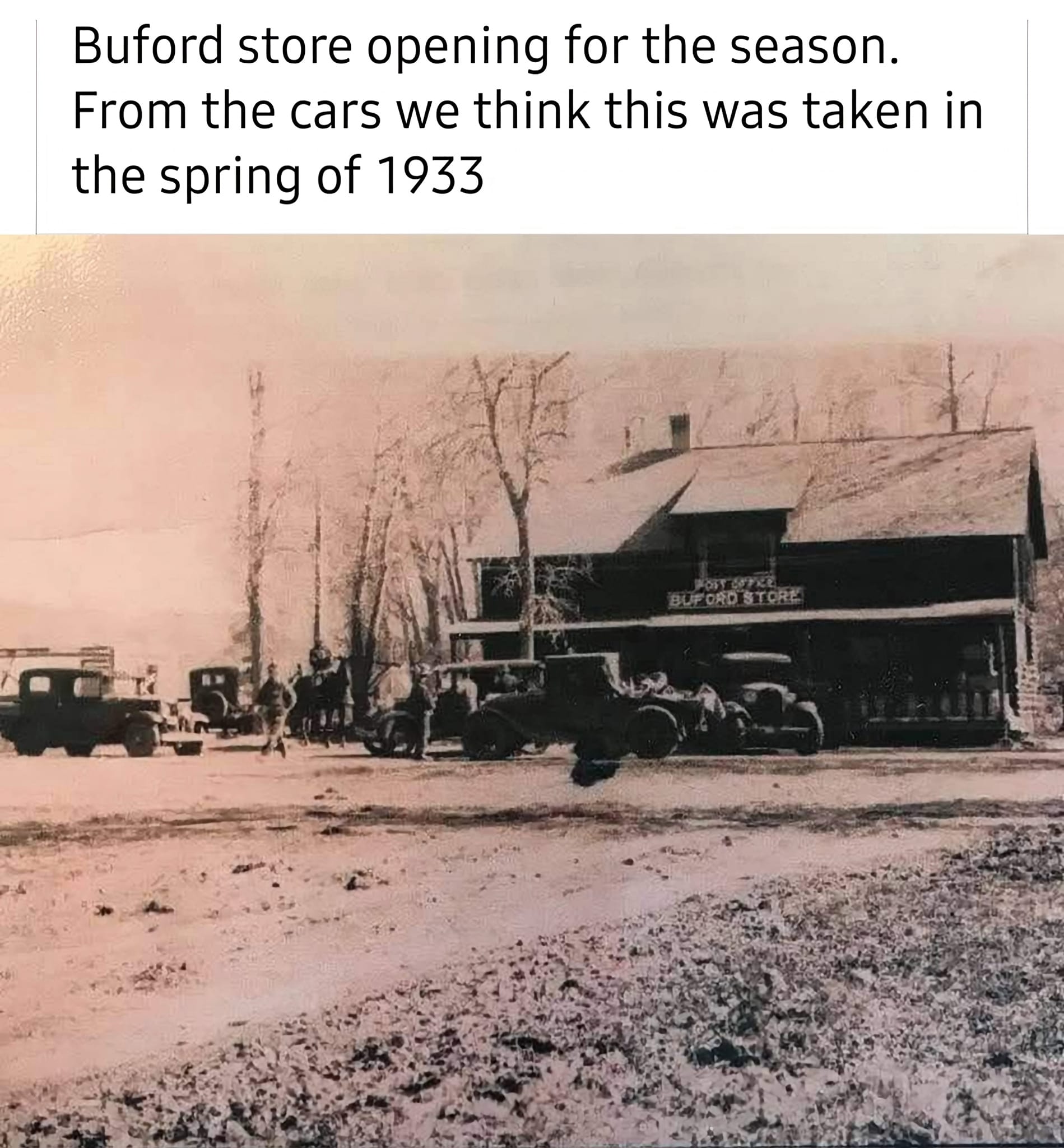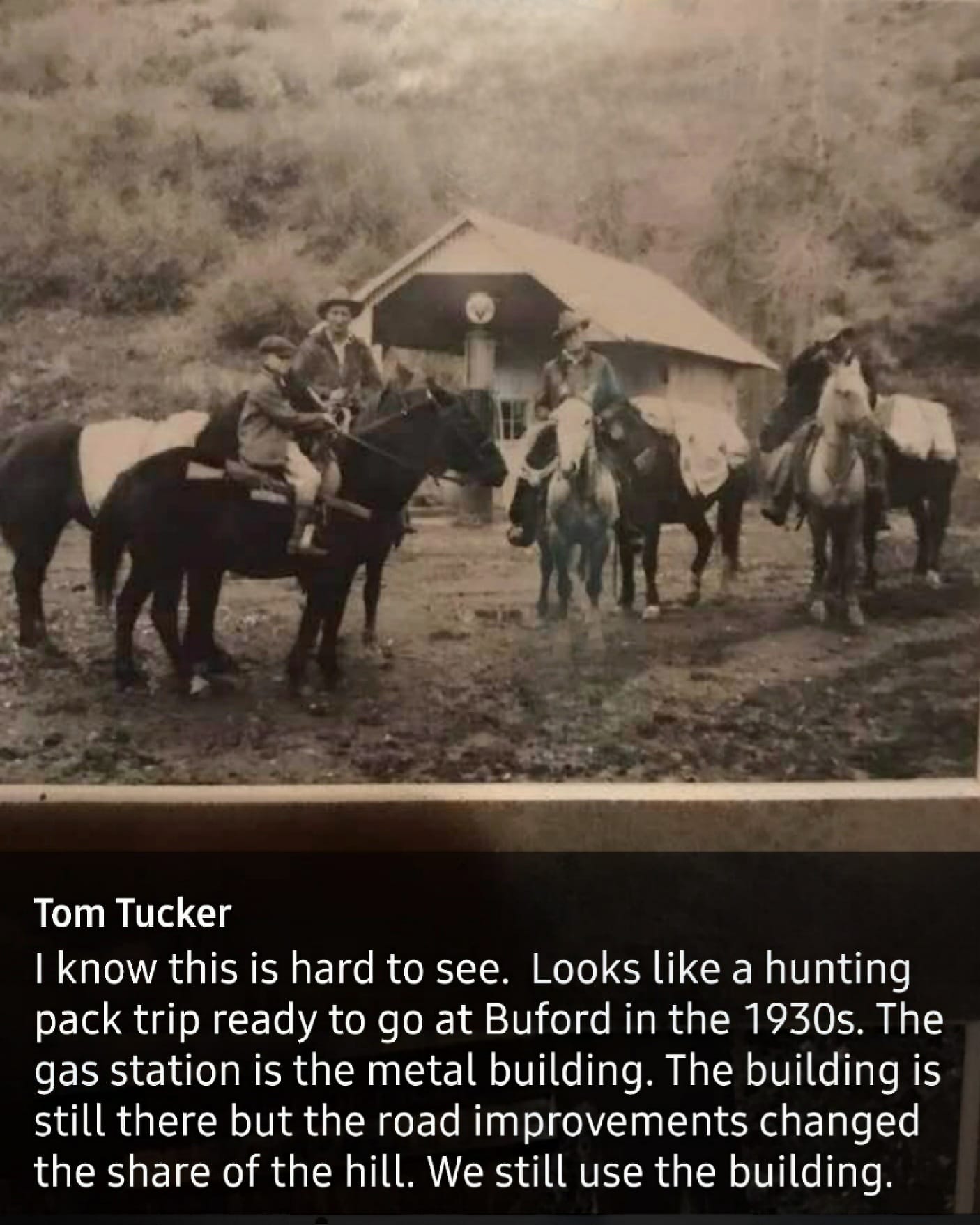 Tom Tucker ~ I know this is hard to see. Looks like a hunting pack trip ready to go at Buford in the 1930's. The gas station is the metal building. The building is still there but the road improvements changed the shape of the hill. W still use the building.