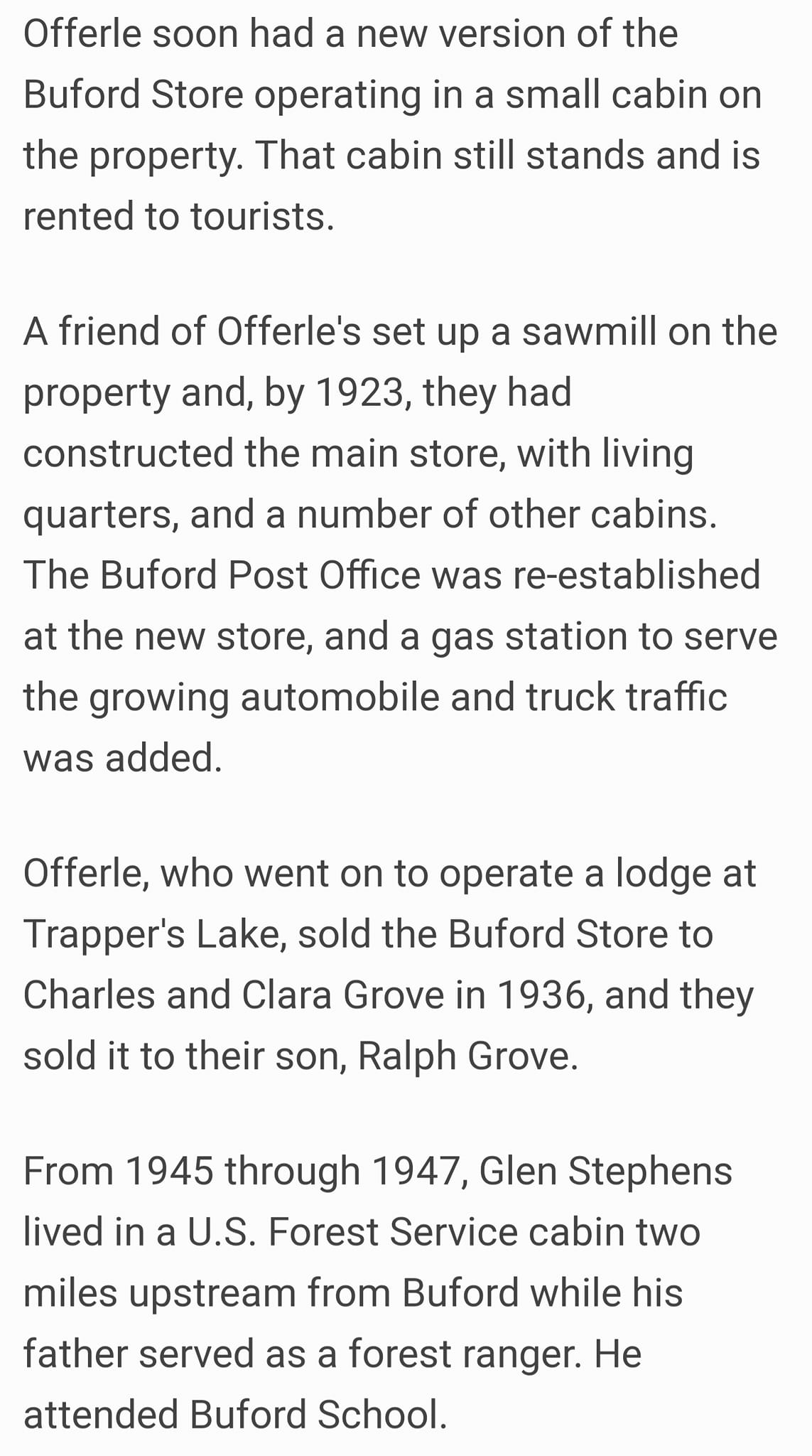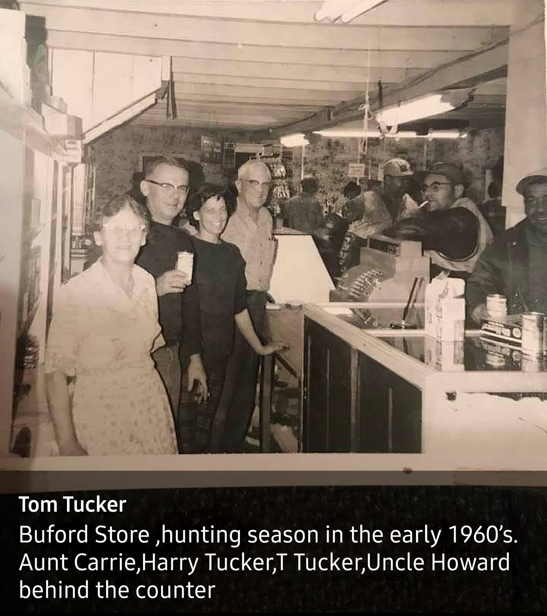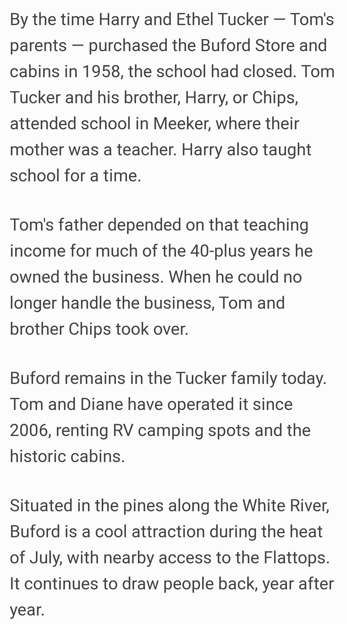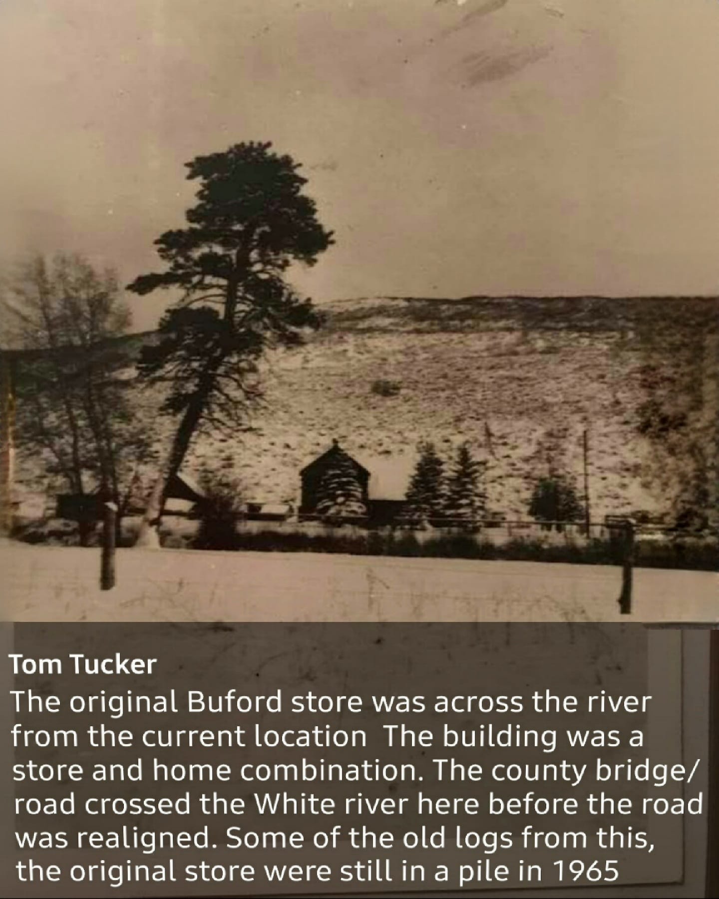 Tom Tucker ~ The original Buford store was across the river from the current location. The building was a store and home combination. The county bridge/road crossed the White River here before the road was realigned. Some of the old logs from this, the original store wer still in a pile in 1965.