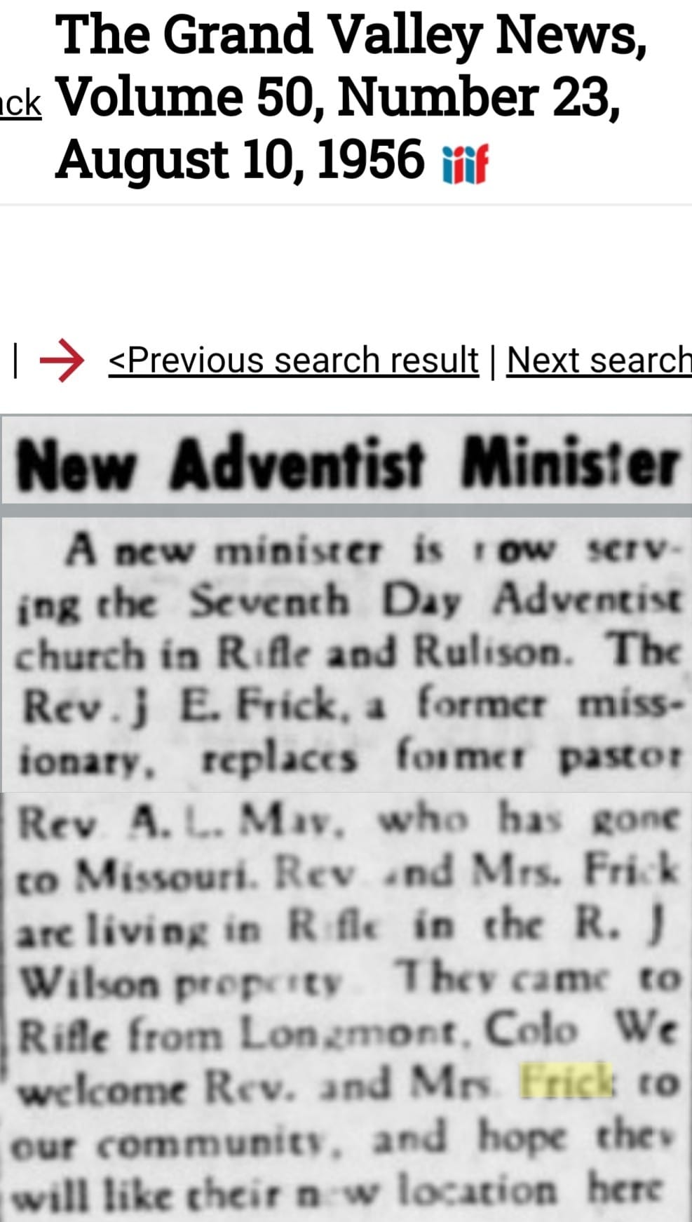 J. E. Frick was pastor of the 7th Day Adventist Church in Rifle and the