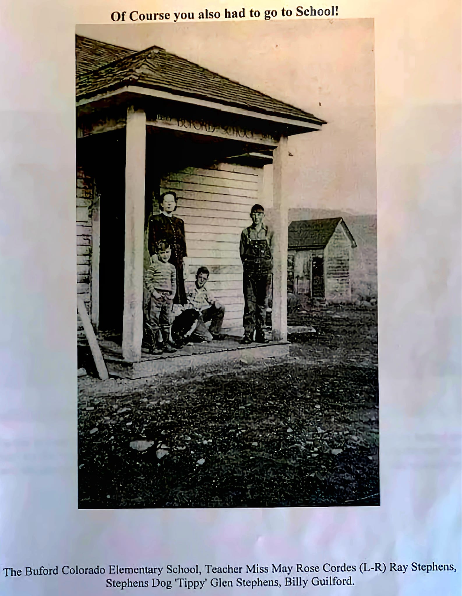 The Buford Colorado Elemetary School, Teacher Miss May Rose Cordes (L-R) Ray Stephens, Stephens dog 'Tippy' Glen Stephens, Billy Guilford. See a glimpse of the town history