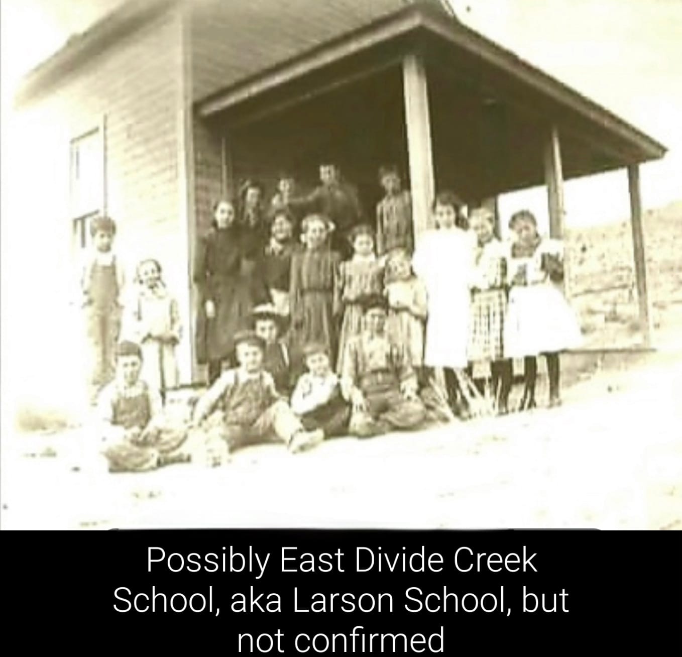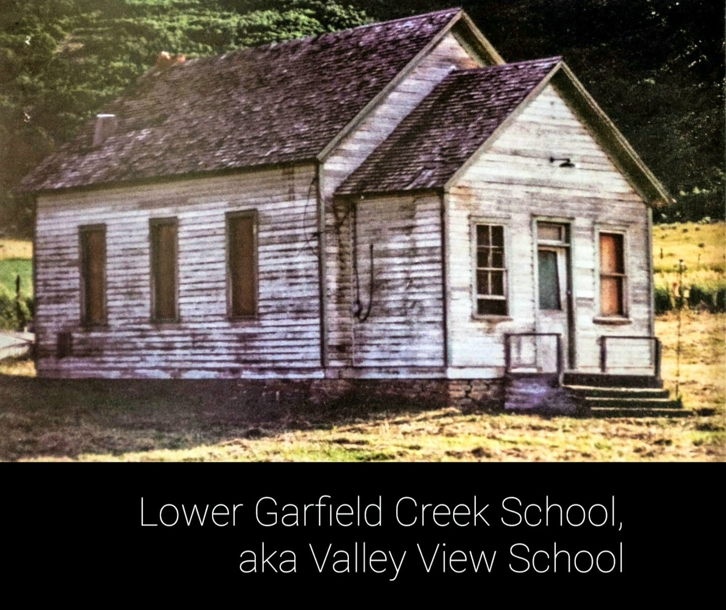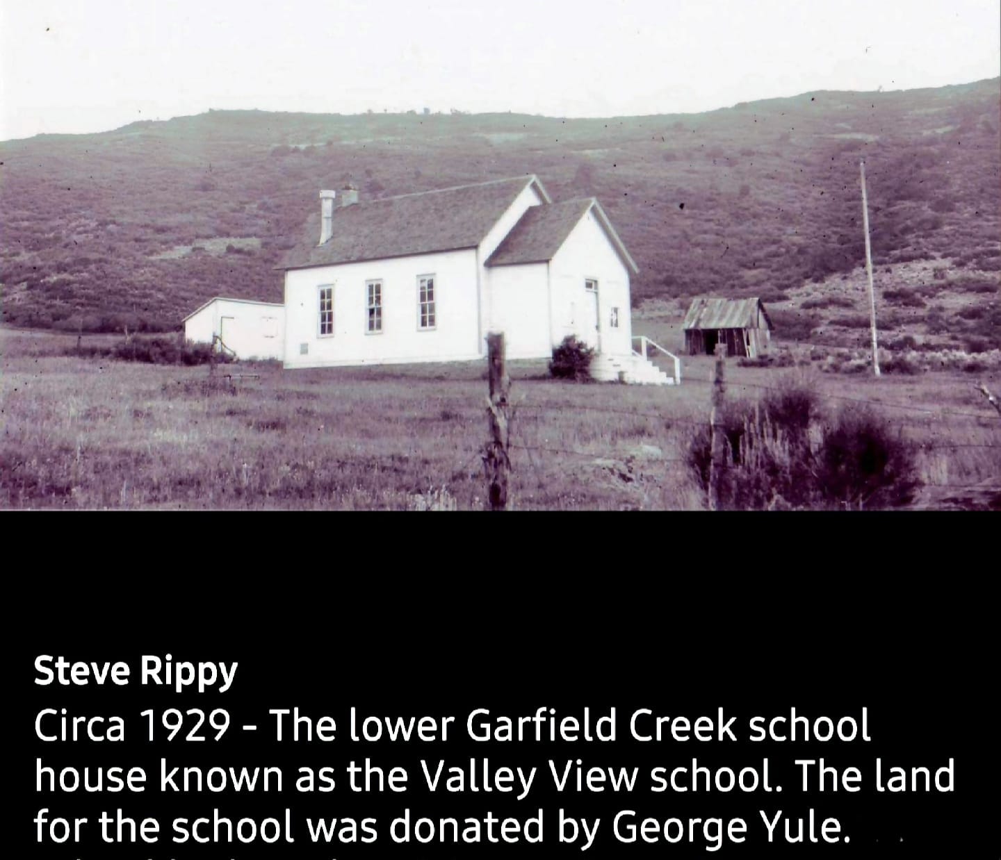 Circa 1929 - The lower Garfield Creek School house known as the Valley Veiw School. The land for the school was donated by George Yule.