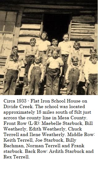 Flat Iron School photo. Circa 1933. On Divide Creek, 18 miles south of Silt,