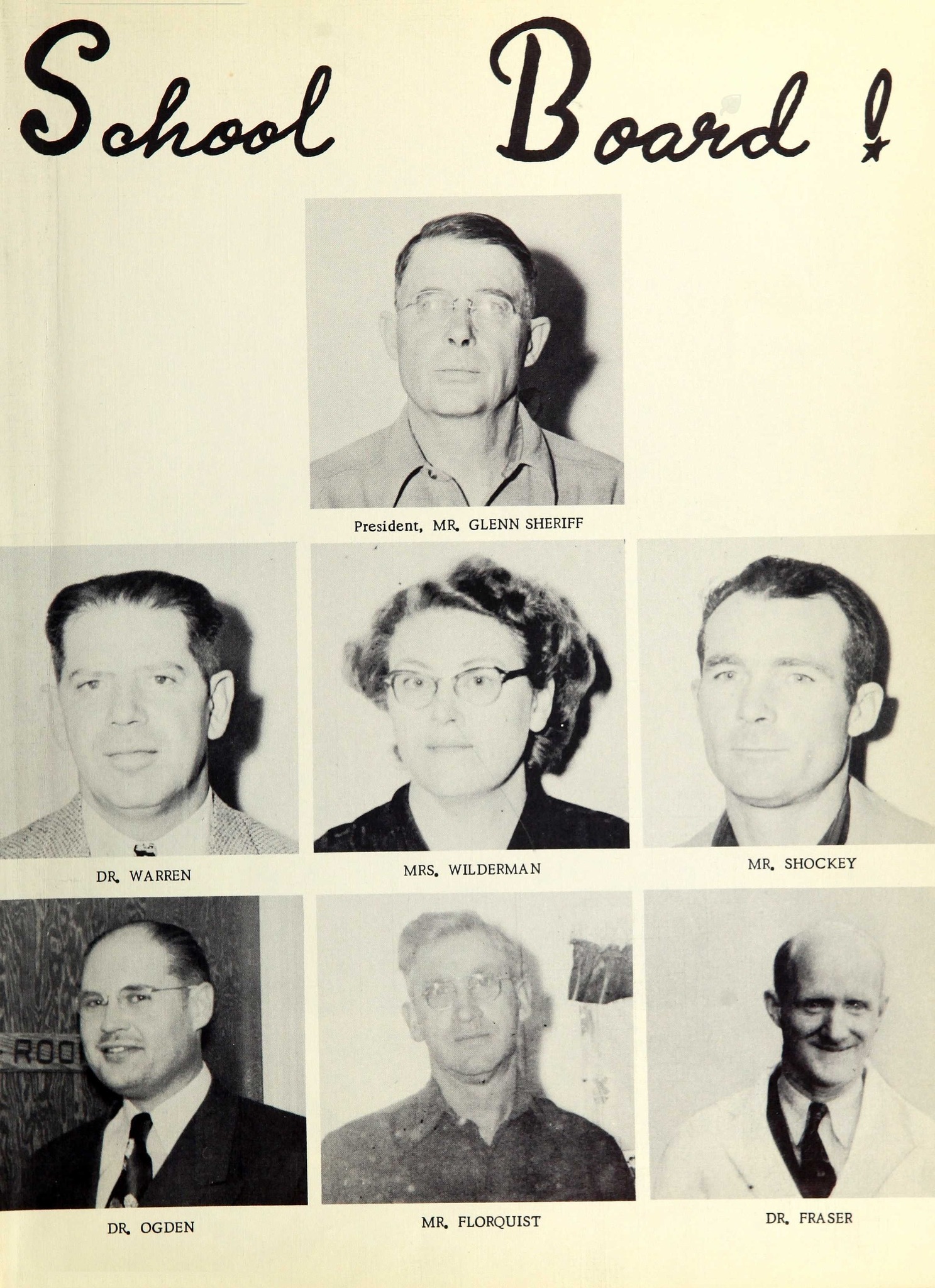 1954 School Board: President, Mr Glenn Sheriff, Dr. Warren, Mrs. Wilderman, Mr. Shockey, Dr. Odgen, Mr. Florquiest and Dr. Fraser