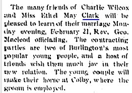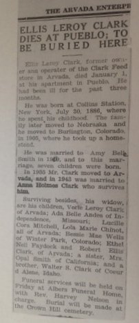 Opal(Clark) Smith wrote a wonderful story about Harrison and Nellie Nellie worked for an invalid cousin, and there she met my father Harrison Clark. They were married in 1884 in Springville, NY. That year, Harrison was working for his brother, Harvey, and he got his board and room with wages so long as that brother lived in part of the house with his parents, Lewis and Louisa. They had Nellie come and live with them. Grandma Clark was a wonderful, gentle lady. Nellie loved her like her own mother. She gave Nellie a small soft pillow and all her life Nellie used that pillow. She thought she could not sleep on any other pillow and she was very particular about that pillow. She never allowed us children to play with it, or treat it carelessly, except if we were sick. It was a treat to be allowed to lie on it. It was strictly "tabo" for us to have it. I suppose she used it every night of her life, for I know if she ever left home, she always took her pillow along with her night gown. I know she used it the night that she died.. . A year later Harrison rented a farm and they started keeping house. Their first son was born July 1886, and they were proud of their Ellis Leroy. Ethel May was born 2 years later. About that time, they were attending revival meetings, and were both converted. Nellie kept her faith clear and bright all her life, but Harrison backslided and for many years he was not a Christian. Walter was born in 1894 and when he was about 4 years old they moved to Nebraska. The life was a hard pioneer struggle. Cold winters and the house where they lived had a cellar for the kitchen. It was dug out of the bank, with just one side boarded up. They used a ladder to go up stairs to the second floor, up above was an attic whre they had another sleeping room. Opal Lillan was born Dec. 17th 1900. When Ethel was 12 years old and Ellis 14, when they called the children to come in and see their new baby sister. Ellis looked at me and said "shucks, now there won't be an extra piece of pie". Mother always made big pies and cut them in 6 pieces, and Ellis generally got away with the extra piece.. . Prosperity came along, with lots of hard work and perseverance, and they built on an addition, so there was a nice large sunny kitchen and bedrooms. Life seemed smiling on them, but Dad felt the call to go farther west. He heard of free land in Colorado. He also heard of the wonderful water they had in Colorado, and wanted to leave the hard Alkali water where he lived, as it was affecting his kidneys. It was hard for Mother to again pull up and leave a comfortable home for in New York, they had just completed a wonderful new large farm home when they moved to Nebraska. I remember after Dad came home to Nebraska, after he had made a trip to Colorado to see what the conditions were there, he brought a small bottle of water back with him and had each of us taste it so we could see how good and pure the water was. I was 5 years old then and in March of 1906, after he had gone ahead, with the stock and furniture, and belongings, he sent for Mother to come on with Ethel, Walter and I. We went to Burlington, and when we got to the shabby little town, the wind was so strong we had to hold to posts to keep from being blown away as we walked from the depot to a hotel where we stayed till Dad sent a "two-seated buggy" to take us out to the homestead, 18 miles north of Burlington. It was a bitter cold day when we made the trip. We had to cover our heads with a buffalo robe to keep from freezing, and there was a poor road, hardly more than a trail that led over the prairie. The driver pointed his long buggy whip toward some cow manure and said "now there is buffalo chips". That is what we use for fuel. After that Walter and I used to walk around and try to distinguish which were buffalo chips and what was just plain cow chips!! We didn't realize that the word buffalo came from the fact that the cattle ate the buffalo grass. It was the wirey kind of grass that kept the chips together so they were like large flat pancakes. Later we used to take large lumber wagons and go out on the prairie and pick up loads and loads of chips and stack them close to the kitchen door, so our winter supply of fuel was handy. Every little sod shack had its pile of buffalo chips close by.... . Dad built a big frame house, and it was a landmark over the country. It had a story-and-a-half with a stairway, and a large kitchen built on a well. There was a large frame barn, and a frame corncrib and grainary combined with an alley-way between where he kept the grain drill. Dad always took good care of his farm supplies and implements and didn't let them stand out in the weather. He had a well dug, and the water was truly the best in the world. I often wish after some now. People came for miles around to get water and take it in barrels to their sod shacks. It was the only well for some distance around for a while. Dad bought a herd of cattle, but the rancher took advantage of his ignorance and he got a poor bunch of animals. Some were "locoed" a result of eating the loco weed that came up first in the spring. They were so drugged that they wouldn't eat anything else. It was one of the problems of the rancher to get rid of the loco weed, and they carried a sharp shovel around to dig up the weeds. I have heard it said that the loco weed was the same as the Marijuana that the Mexicans smoke, and that our young citizens smoke for a thrill. It made the cows hesitate to attack a rider on a horse. The cattle had long horns at first, which made them double dangerous.. . I remember after we moved into our house, one day a herd of wild range cattle were following the cow trail which led near our house - they plodded along with their heads down - going down to the Launchman creek for water, I suppose--when suddenly on of them raised his head and saw the strange spectacle of a framehouse near by. They gave a bellow of terrror and a stampede followed, it