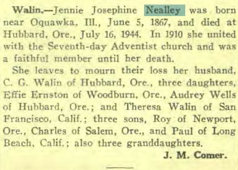 Jennie J. Walin 1867-1944 is buried in Woodburn Oregon # 80532389. So is Charles G. Walin 1868-1959.